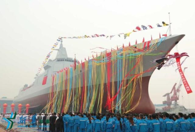 ?。箷r(shí)許,儀式開始,隨著儀式現(xiàn)場(chǎng)全體人員齊聲高唱的國(guó)歌聲,鮮艷的五星紅旗冉冉升起。剪彩后進(jìn)行了“擲瓶禮”,一瓶香檳酒在艦艏摔碎,絢麗的彩帶從兩舷噴射而出,新型驅(qū)逐艦鳴響汽笛,全場(chǎng)響起熱烈掌聲。隨后,驅(qū)逐艦在拖曳牽引下緩緩移上浮箱后下水。