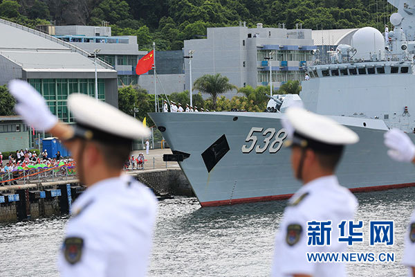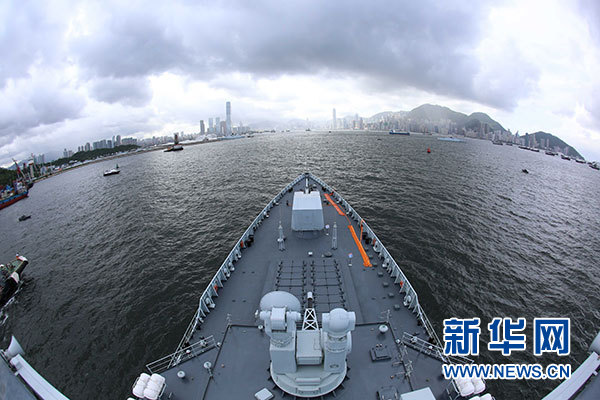 7月7日,海軍銀川艦駛?cè)胂愀郯捍薮a頭。當(dāng)日,正在執(zhí)行跨區(qū)機動訓(xùn)練任務(wù)的中國人民解放軍海軍航母編隊抵達(dá)香港,參加香港回歸祖國暨中國人民解放軍進(jìn)駐香港20周年慶?;顒?,受到香港特區(qū)政府和民眾熱烈歡迎。新華社記者 曾濤 攝