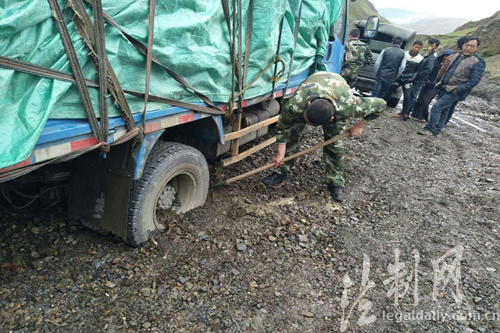 ????連日來,受強(qiáng)降雨天氣影響,通往西藏山南市錯那縣卡達(dá)鄉(xiāng)道路因山體塌方和泥石流損毀嚴(yán)重,7月23日中午12時,西藏邊防總隊山南邊防支隊卡達(dá)邊防派出所接轄區(qū)居民電話報警稱:商店運貨貨車在返回卡達(dá)鄉(xiāng)途中陷入泥潭,請求派出所救援。接到消息后,該所迅速組織官兵趕往現(xiàn)場,并持續(xù)關(guān)注道路情況和受困狀況。到達(dá)現(xiàn)場后,邊防官兵立即展開救援,用十字鎬挖、用手刨、用人推,經(jīng)過2個小時的不懈努力,最終成功把陷入泥坑的貨車?yán)觥>仍Y(jié)束后,邊防官兵就近取材把泥坑填平,并設(shè)立警示標(biāo)志,確保后續(xù)車輛順利通過。現(xiàn)場無人員受傷,車輛完好。