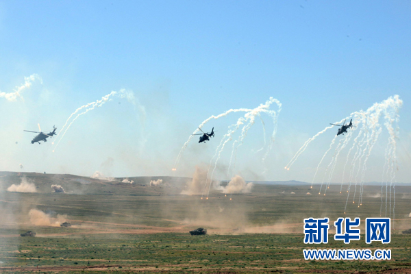 “和平使命-2014”聯(lián)合軍演中,原陸軍第38集團軍某紅軍團突擊分隊在陸航掩護下沖擊目標陣地 (2014年8月26日攝)。新華社發(fā)
