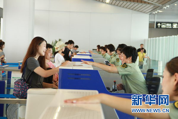 青島邊檢站檢查員熱情服務(wù)出入境旅客。