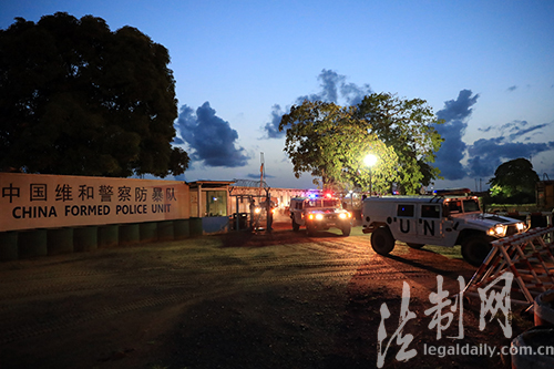 圖為天色漸暗,中國維和警察防暴隊巡邏組乘車駛出營區(qū)