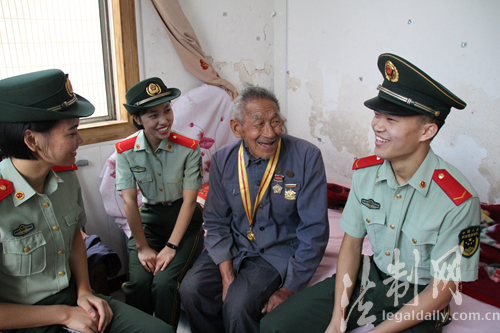 ????9月2日上午,在紀念抗日戰(zhàn)爭暨世界反法西斯戰(zhàn)爭勝利72周年之際,江蘇邊防總隊鎮(zhèn)江邊防檢查站揚中分站組織官兵到駐地社區(qū)看望慰問抗戰(zhàn)老兵倪正六老人,認真聆聽“老兵”講述當年抗戰(zhàn)的故事。