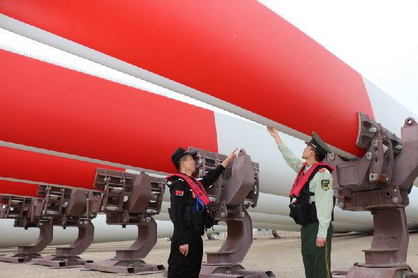福建莆田邊檢站官兵正在對巨型風電葉片進行安全檢查