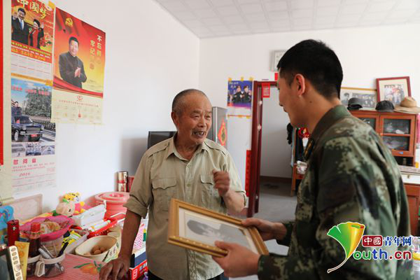 ????孟慶欣老人向年輕戰(zhàn)士講述自己的從軍經(jīng)歷。通訊員供圖