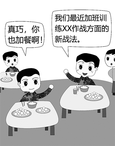 ????“真巧,你也來加餐啊?!薄笆前?,我們營(yíng)最近在研訓(xùn)新戰(zhàn)法,有時(shí)會(huì)加班訓(xùn)練……我跟你說,我們研究的新戰(zhàn)法主要是××作戰(zhàn)方面,據(jù)說要在全旅推廣呢!”