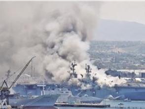 ????當?shù)貢r間7月12日上午8時30分許,停泊在美國加利福尼亞州圣迭戈海軍基地的“好人理查德”號兩棲攻擊艦突發(fā)大火?!昂萌死聿榈隆碧枌儆邳S蜂級兩棲攻擊艦,滿載排水量達4萬噸,通常搭載1200名艦員。該艦發(fā)生事故時正在進行中期維護,主要對飛行甲板進行升級改造,以迎接F-35B戰(zhàn)斗機上艦部署。