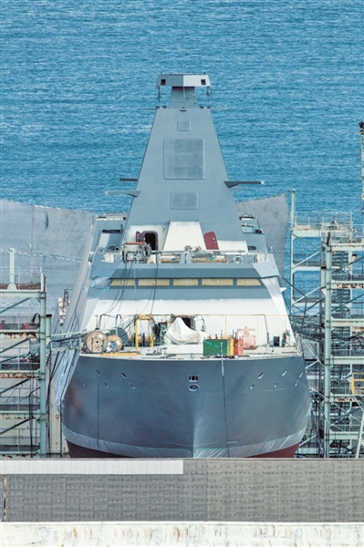 ????先進(jìn)雷達(dá)技術(shù)方面,30FFM采用先進(jìn)的封閉式綜合射頻桅桿,具有結(jié)構(gòu)強(qiáng)度高、雷達(dá)散射截面積小、電子設(shè)備集成性好等優(yōu)點(diǎn)。該艦首次將相控陣?yán)走_(dá)陣列集成在桅桿上,同時(shí)還布置了4面OPY-2型X波段多功能相控陣?yán)走_(dá),執(zhí)行對(duì)空、對(duì)海搜索任務(wù)。下方小尺寸天線陣列是NOLQ-3E電子戰(zhàn)系統(tǒng)。此外,桅桿上還集成了OAX-3光電傳感器,但未安裝雙波段雷達(dá),因此探測(cè)距離和精度不足。