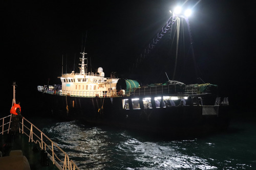 ????被海警執(zhí)法員發(fā)現(xiàn)的走私集團(tuán)的供油母船(12月13日攝)。新華社發(fā)(敖玉洪 攝)