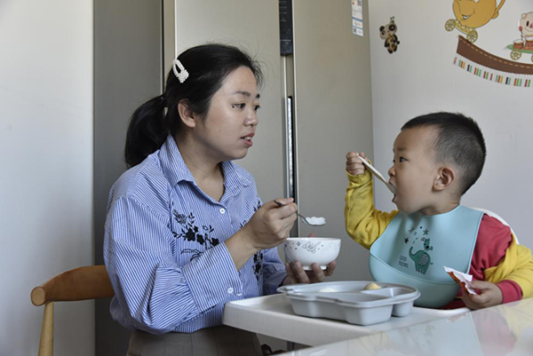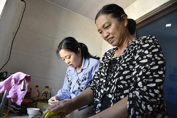 鄭如輔導(dǎo)大兒子做作業(yè)。