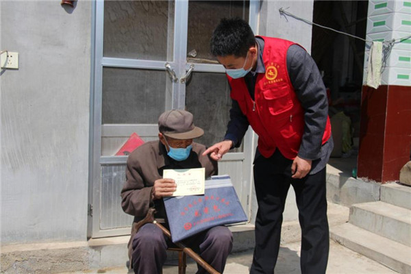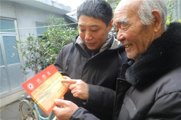 ????費(fèi)縣胡陽(yáng)鎮(zhèn)退役軍人服務(wù)站站長(zhǎng)張中方為優(yōu)撫對(duì)象送光榮單。李永臣 攝