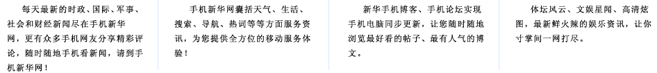 手機(jī)新華網(wǎng)是新華網(wǎng)的手機(jī)無(wú)線門(mén)戶網(wǎng)站,是中國(guó)最具權(quán)威的免費(fèi)手機(jī)新聞網(wǎng)站之一。歡迎各地電信運(yùn)營(yíng)商以及廣告界、企業(yè)界、商務(wù)界、傳媒界等各界人士與我們聯(lián)系,精誠(chéng)合作,實(shí)現(xiàn)共贏。電話:010-63070908,E-mail:xhsjb@xinhuanet.com
