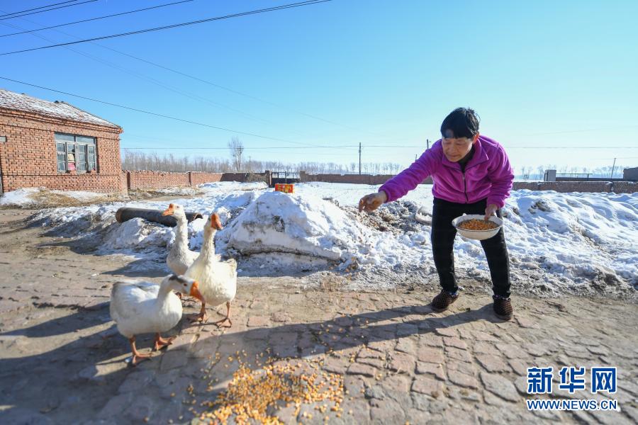 2月9日,在吉林省長(zhǎng)春市農(nóng)安縣楊樹林鄉(xiāng)牛尾巴山村,付寶印的母親鐘士輝在喂鵝。新華社記者 張楠 攝