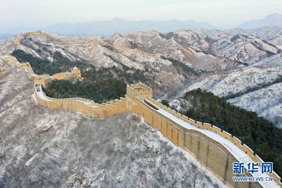 這是3月1日在河北承德境內(nèi)拍攝的金山嶺長城雪景(無人機照片)。新華社發(fā)(周萬平 攝)