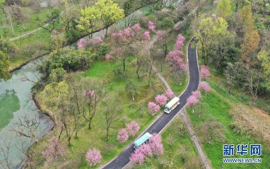 3月2日,觀光車在西溪濕地內(nèi)行駛(無人機照片)。
