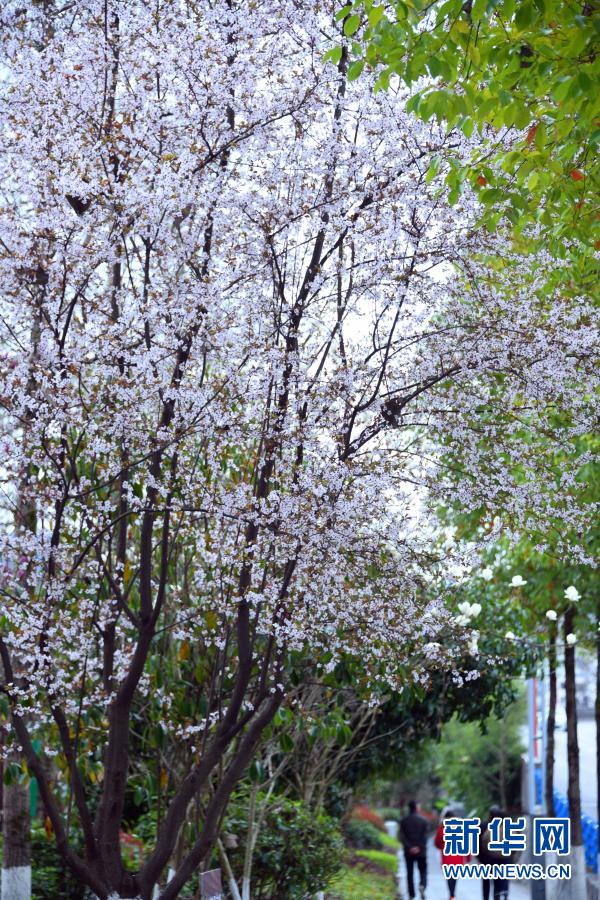 3月2日,市民走在湖北省恩施土家族苗族自治州宣恩縣貢水河畔的櫻花樹下。新華社發(fā)(王俊 攝)