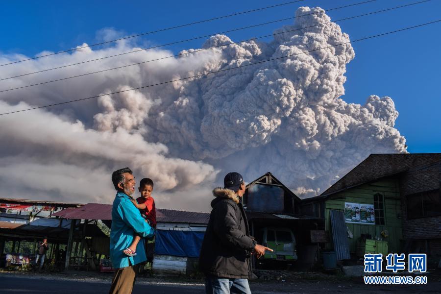 3月2日,人們在印度尼西亞北蘇門答臘省卡羅觀看噴發(fā)的錫納朋火山。新華社發(fā)(森比林攝)