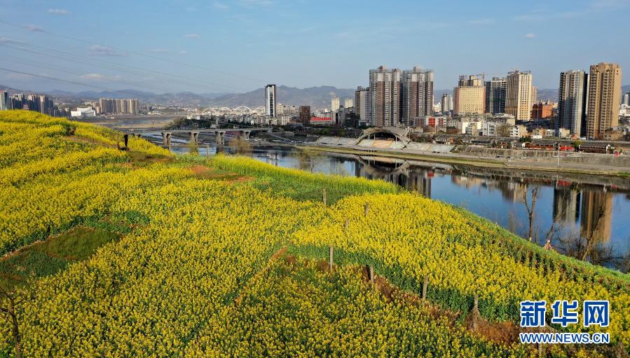 3月3日,漢江之濱安康市區(qū)的山坡上開滿油菜花(無人機照片)。新華社記者 陶明 攝