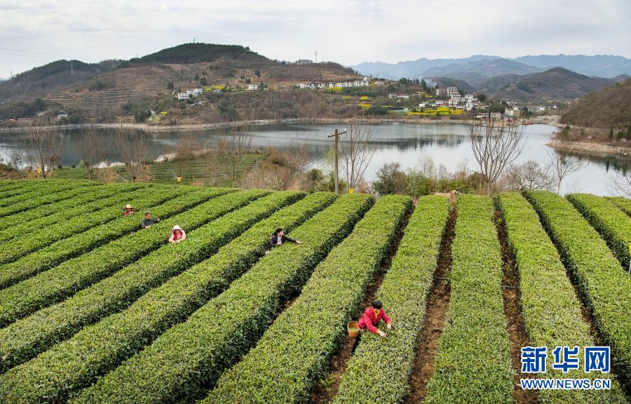 3月4日,茶農(nóng)在安康市漢濱區(qū)流水鎮(zhèn)剛子茶葉專業(yè)合作社標(biāo)準(zhǔn)化茶園采摘新茶(無(wú)人機(jī)照片)。新華社記者 陶明 攝