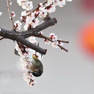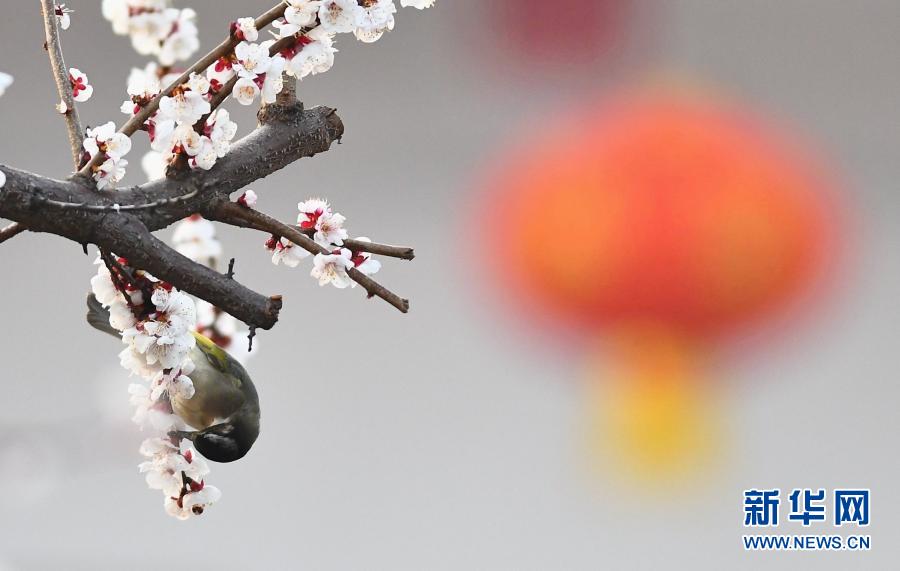 3月8日,小鳥在山東省滕州市公園花枝上覓食。