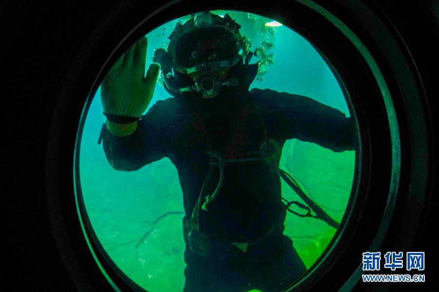 3月15日,在長江水下40多米的白鶴梁題刻無壓容器罩內(nèi),潛水員在對參觀廊道的觀察窗玻璃進行清理。新華社記者 劉潺 攝