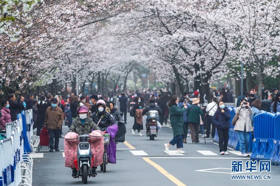 近日,南京街頭盛開的櫻花燦若云霞,吸引眾多市民游客外出賞花游玩,享受春日美景。
