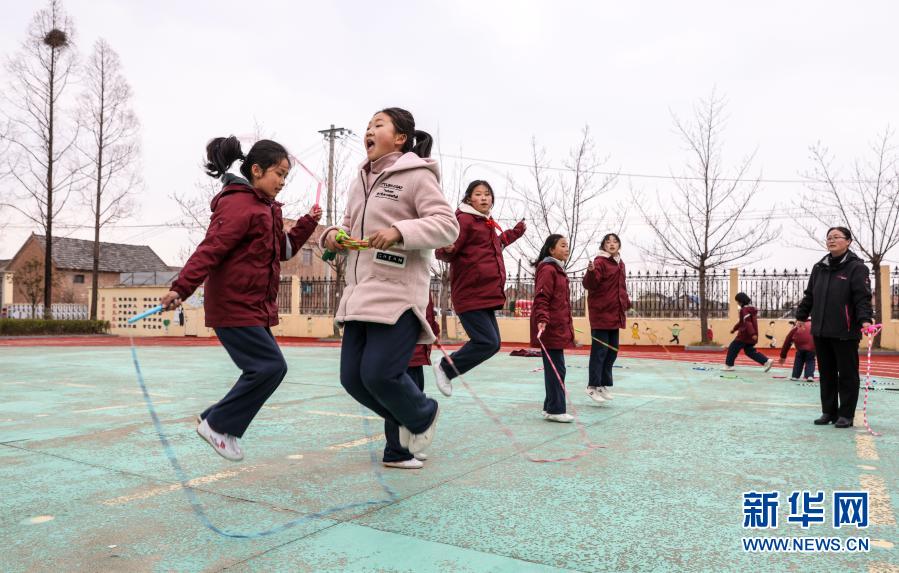 騎路小學(xué)劉彥老師(右一)放學(xué)后輔導(dǎo)學(xué)生練習(xí)花樣跳繩(3月9日攝)。新華社記者 楊磊 攝
