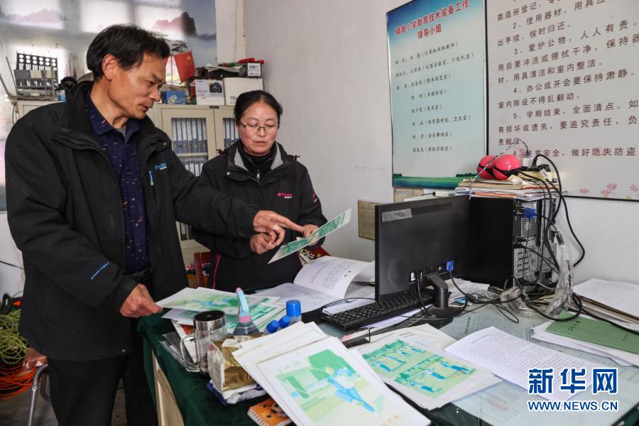 騎路小學劉恩校長(左)和劉彥老師商討跳繩課程綱要(3月9日攝)。新華社記者 楊磊 攝