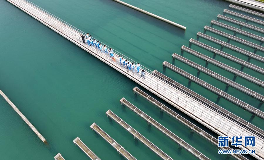 3月21日,水廠工作人員向學生介紹自來水生產(chǎn)流程(無人機照片)。