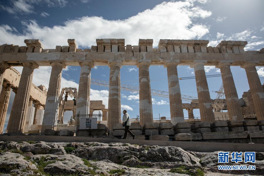 3月22日,一名游客游覽希臘雅典衛(wèi)城。希臘露天考古遺跡22日起恢復(fù)開(kāi)放。游客需遵守保持社交距離和佩戴口罩等防疫規(guī)定。新華社發(fā)(萊夫特里斯·帕察里斯攝)
