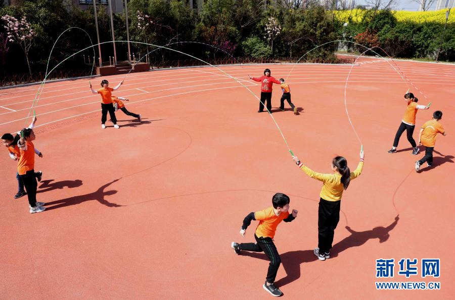 3月23日,在合肥市大通路小學(xué)新海校區(qū),學(xué)生在大課間練習(xí)花樣跳繩。