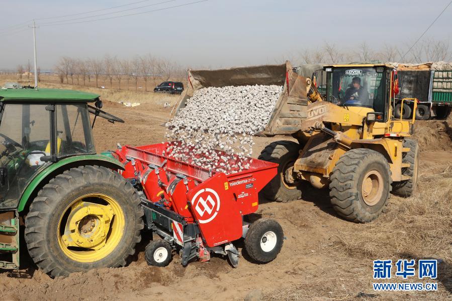 3月23日,工人操作機(jī)械設(shè)備在河北省張家口市萬(wàn)全區(qū)孔家莊鎮(zhèn)張杰莊村轉(zhuǎn)運(yùn)馬鈴薯種。
