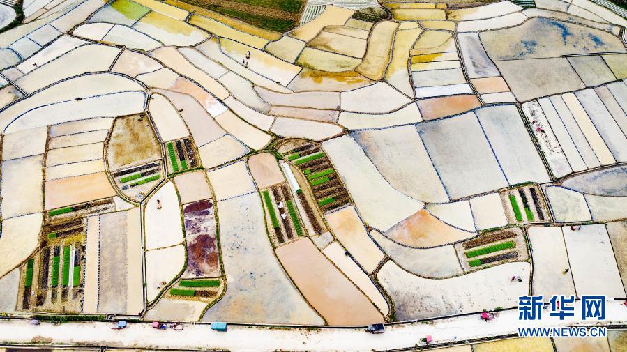 3月24日,廣西河池市東蘭縣武篆鎮(zhèn)色故村農(nóng)民在田間勞作(無人機(jī)照片)。