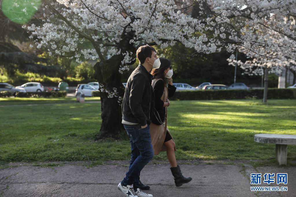 3月24日,佩戴口罩出行的市民從意大利首都羅馬盛開的櫻花樹下走過。新華社記者 程婷婷 攝