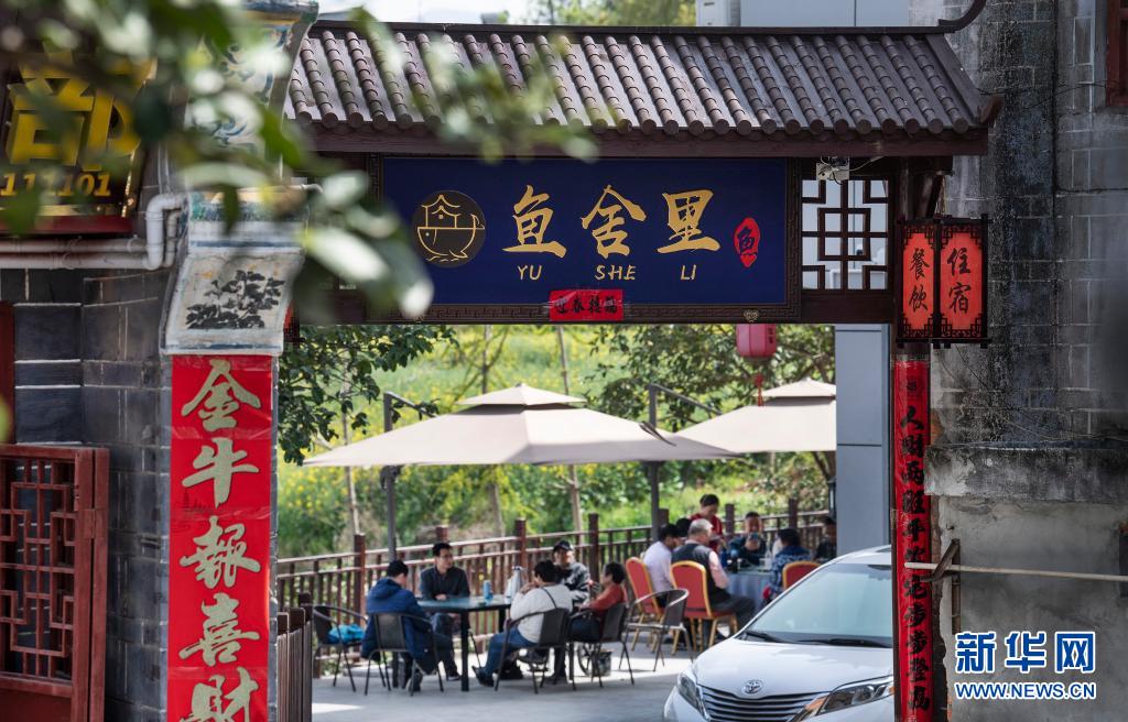 游人在流水鎮(zhèn)的古街上體驗農(nóng)家樂(3月27日攝)。
