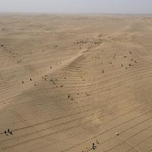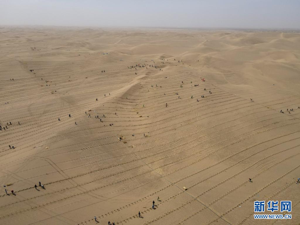 3月28日,人們在且末縣城不遠處的塔克拉瑪干沙漠內(nèi)植樹(無人機照片)。