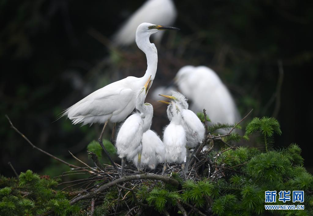 在南昌市新建區(qū)象山森林公園內(nèi),白鷺和雛鳥們?cè)谝黄穑?月18日攝)。