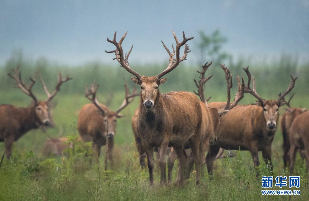 5月17日,一群麋鹿在石首麋鹿國家級自然保護(hù)區(qū)內(nèi)活動(dòng)。