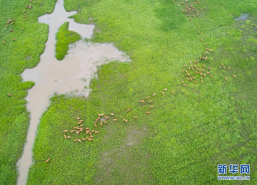 5月17日,一群麋鹿在石首麋鹿國(guó)家級(jí)自然保護(hù)區(qū)內(nèi)活動(dòng)(無(wú)人機(jī)照片)。新華社記者 肖藝九 攝