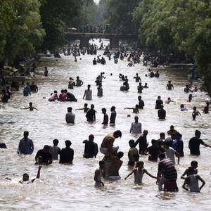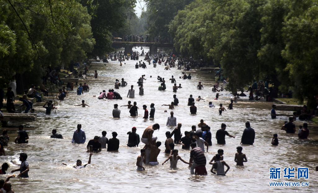 5月30日,人們在巴基斯坦城市拉合爾的溝渠渠水中享受清涼。
