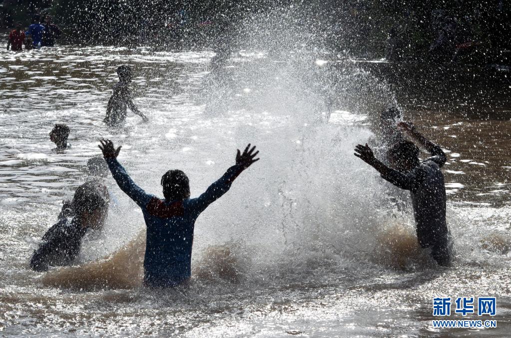 5月30日,人們在巴基斯坦城市拉合爾的溝渠中戲水享受清涼。