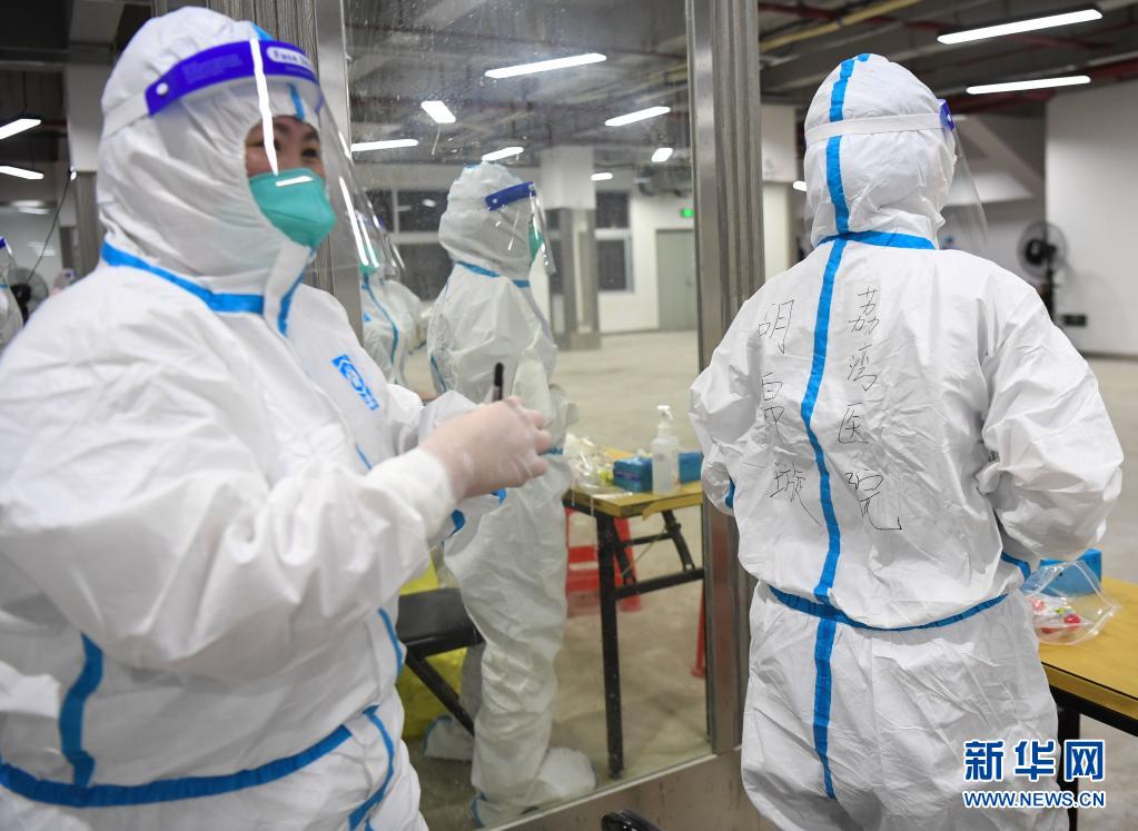 5月26日,在廣州荔灣體育館核酸檢測(cè)點(diǎn),荔灣中心醫(yī)院的醫(yī)務(wù)人員在防護(hù)服上寫(xiě)上個(gè)人信息。新華社記者 鄧華 攝
