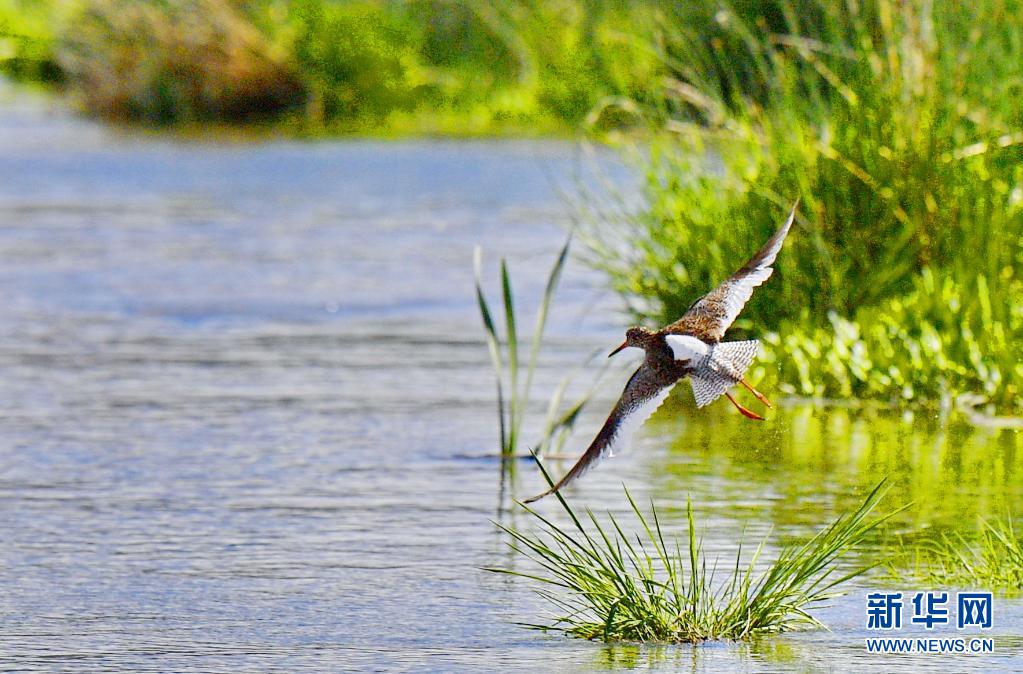 初夏,紅腳鷸在位于西藏拉薩的拉魯濕地國家級自然保護區(qū)內(nèi)起舞覓食。