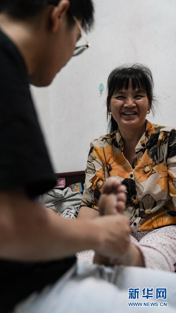 6月1日,趙建軍在宿舍內(nèi)為母親按摩。新華社記者胡晨歡攝