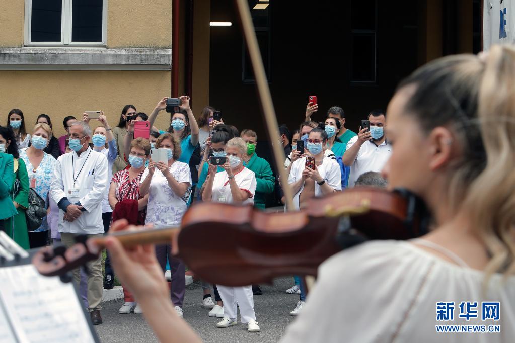 當日,羅馬尼亞首都布加勒斯特一個樂隊在該國一家傳染病醫(yī)院——馬太·巴爾什醫(yī)院演出,向抗擊新冠疫情的醫(yī)務(wù)工作者致謝。