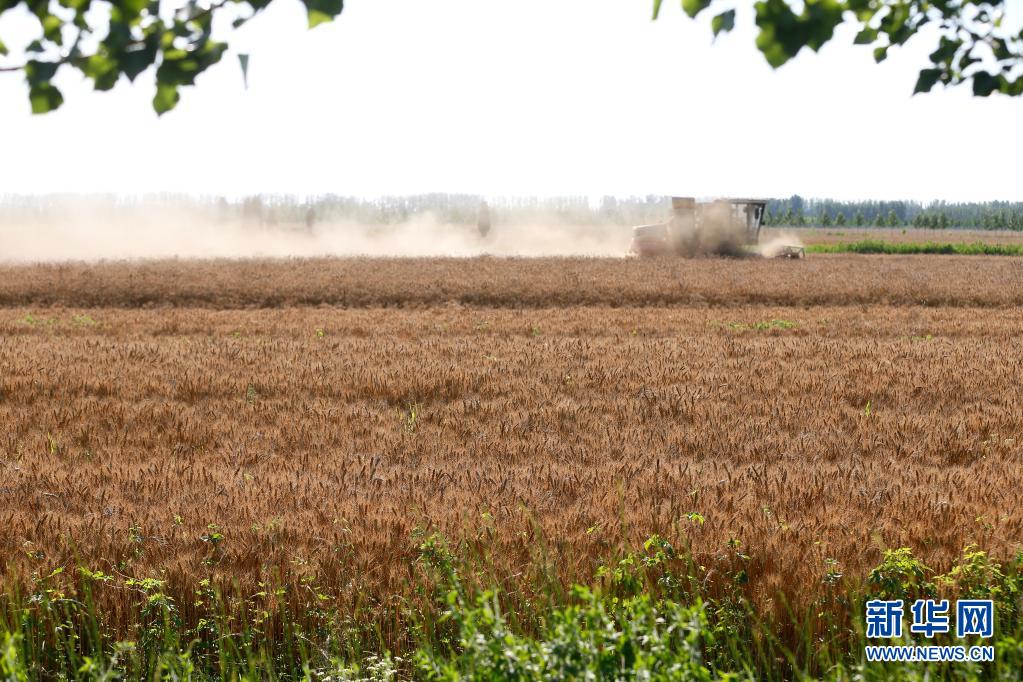 6月20日,收割機(jī)在山東省青島市即墨區(qū)段泊嵐鎮(zhèn)姜家坡村的麥田內(nèi)作業(yè)。