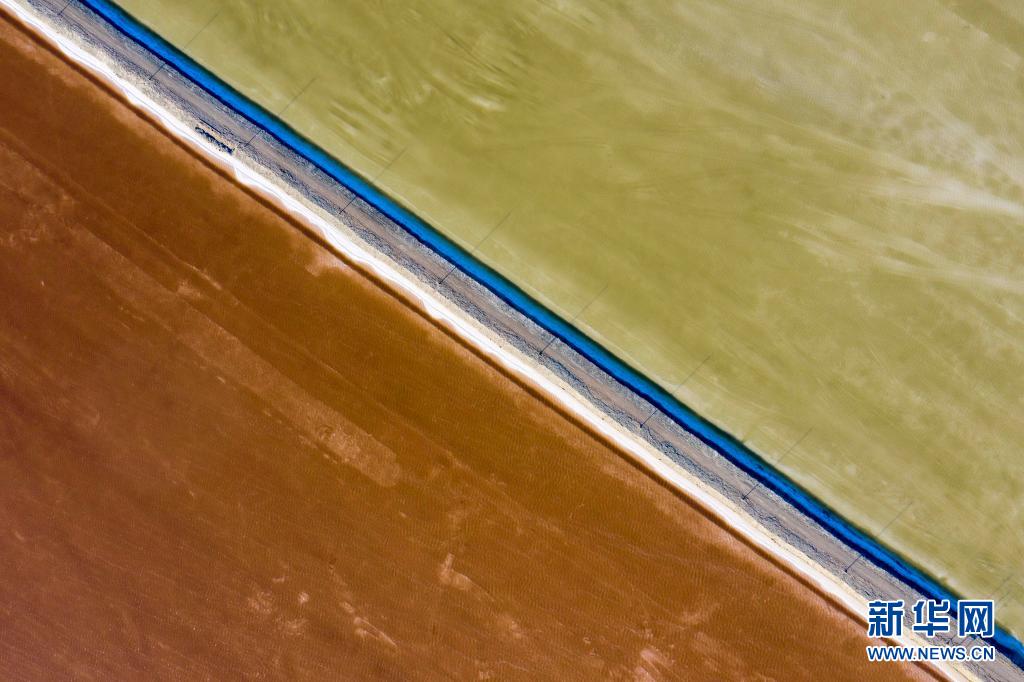 這是在新疆和布克賽爾蒙古自治縣瑪納斯鹽湖中鹽宏達鹽業(yè)生產(chǎn)基地拍攝的一處灘曬池(6月21日攝,無人機照片)。