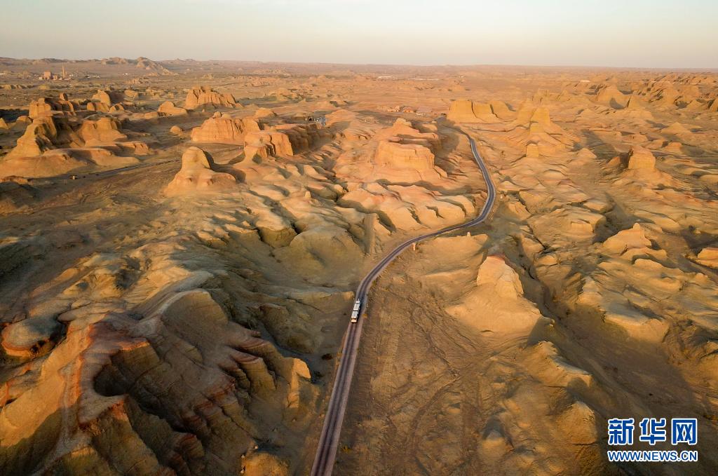 載有游客的觀光車行駛在新疆克拉瑪依烏爾禾世界魔鬼城景區(qū)內(nèi)(6月21日攝,無人機照片)。