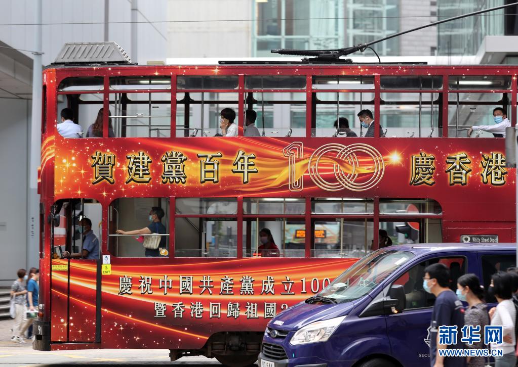 6月29日在香港街頭拍攝的叮叮車(chē)上的慶祝標(biāo)語(yǔ)。