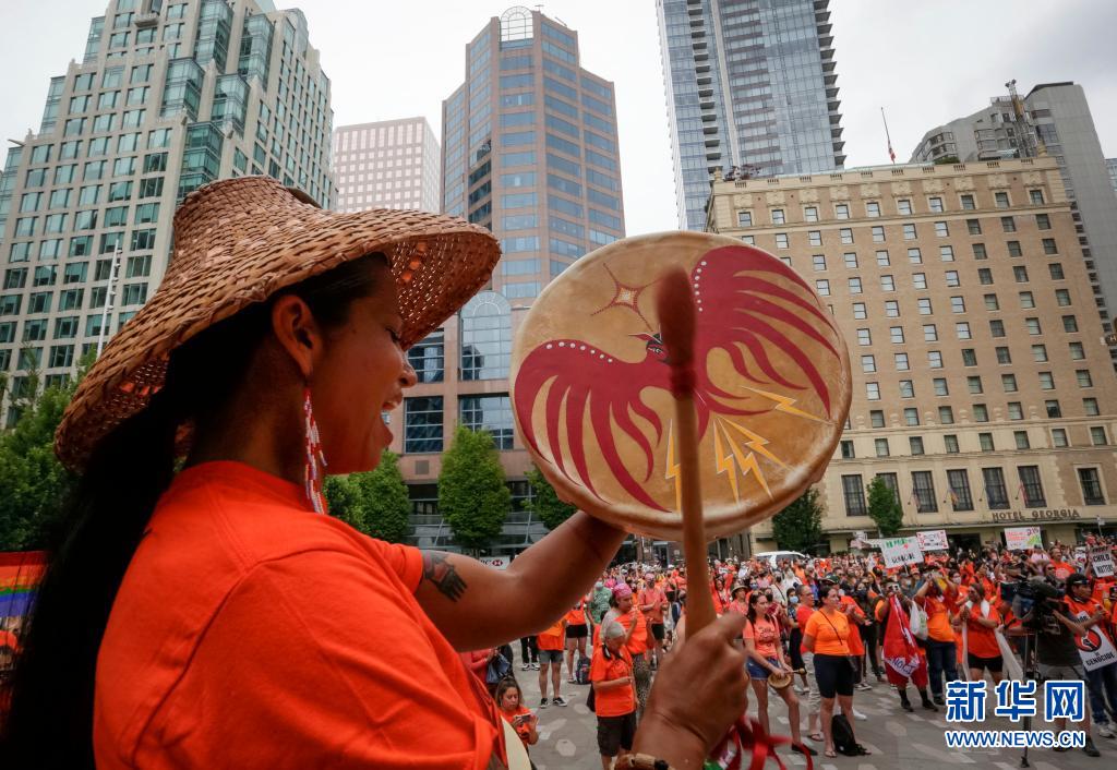 當(dāng)天是加拿大日,上千名抗議者在溫哥華集會,悼念加拿大在強制“同化”原住民過程中遭到殘害的兒童,呼吁取消加拿大日的慶祝活動。